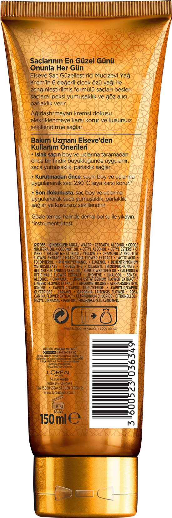 L'Oréal Paris'in önde gelen ürünlerinden biri olan Elseve Mucizevi Yağ Saç Güzelleştirici Krem saç bakımında devrim yaratacak özellikleriyle dikkat çeker. 150 ml'lik şık ve kullanışlı ambalajı sayesinde kolayca kullanılabilir. Ürün, 6 değerli çiçek özü yağı ile zenginleştirilmiş hafif ve ince formülüyle saçlara doğal bir parlaklık kazandırırken saçın yapısını güçlendirir ve sağlıklı görünüm sağlar.